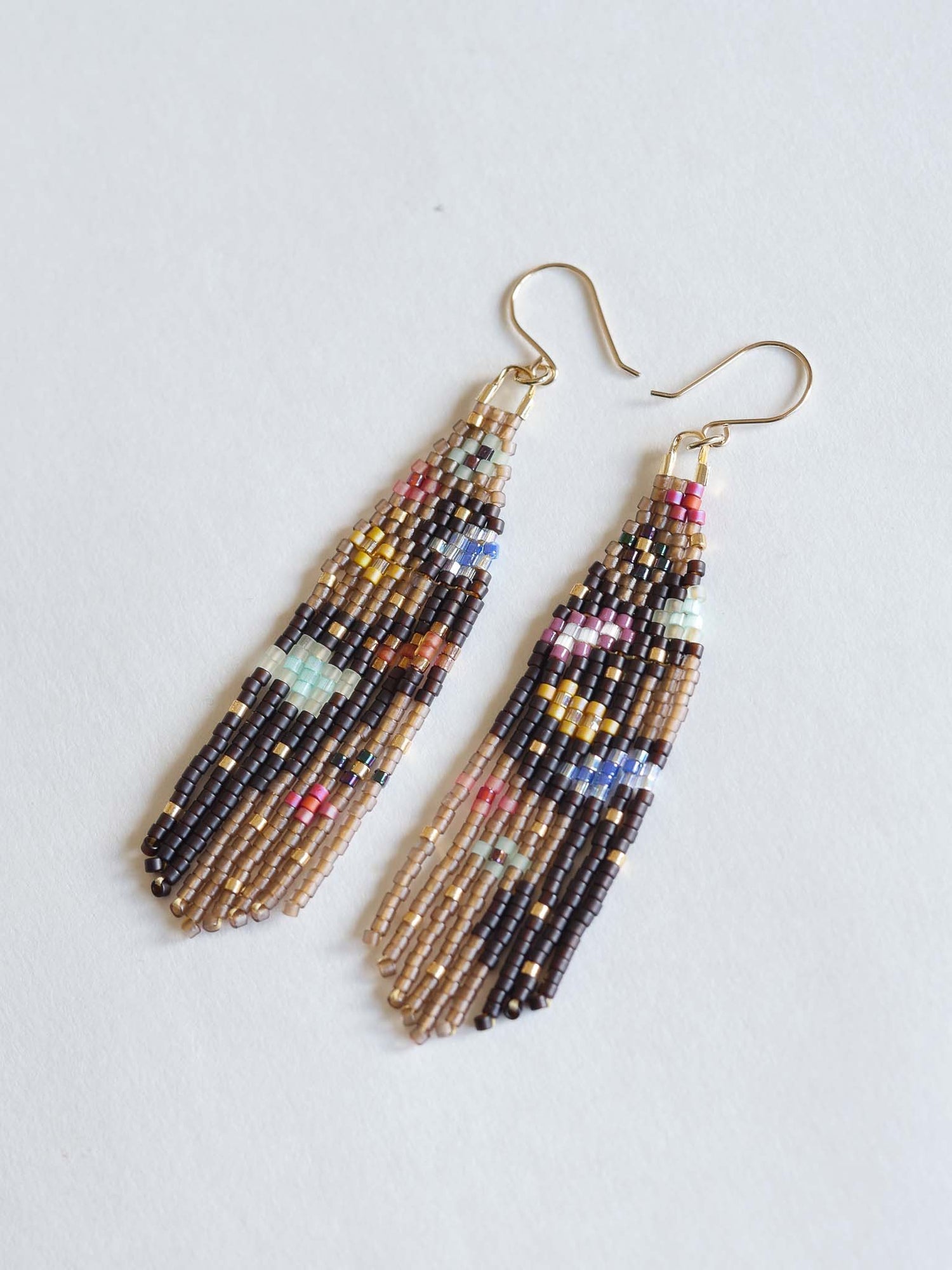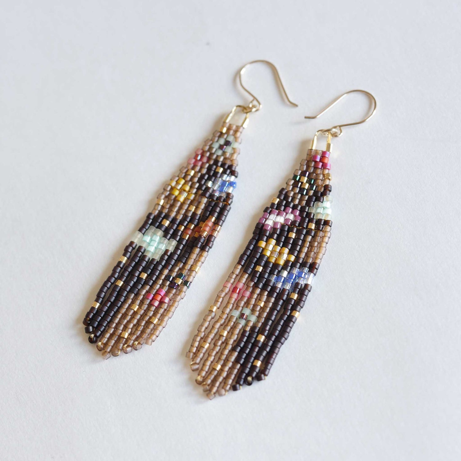 Materials used: two types of Japanese glass beads, golden nylon thread, and the hooks are hand forged 14 KT gold filled wire for sensitive ears.