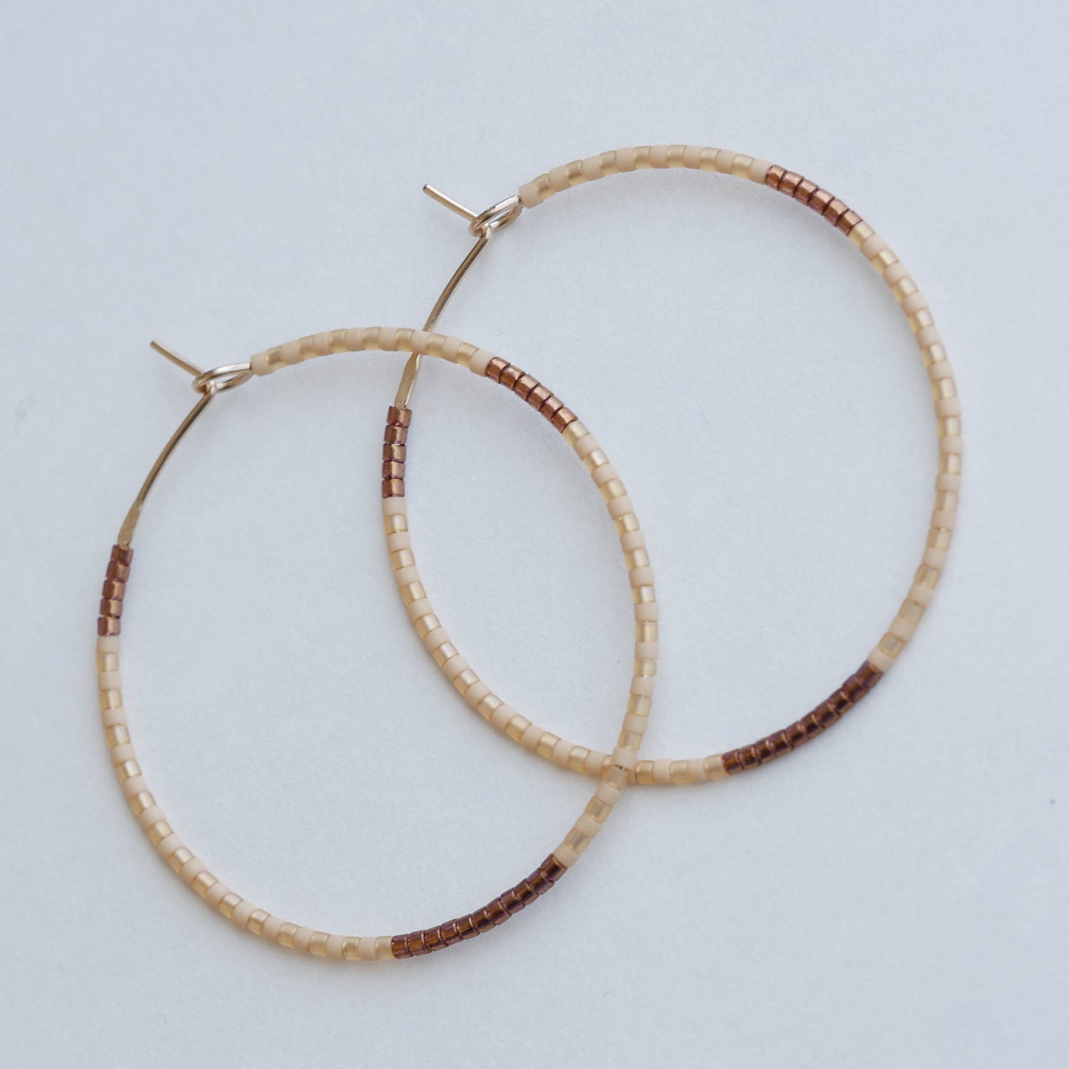 Materials used: Japanese glass beads, and hand forged 14 KT gold filled hoops for sensitive ears.